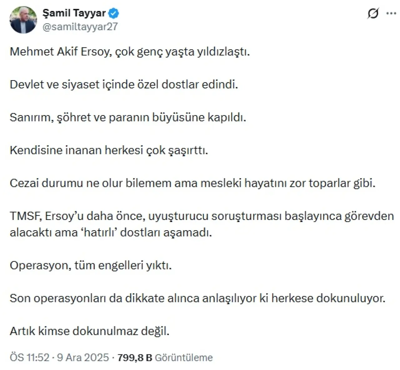 İstanbul Cumhuriyet Başsavcılığının uyuşturucu soruşturması kapsamında gözaltına alınan ve kayyyım TMSF'nin kontrolündeki Habertürk TV Genel Yayın Yönetmenliği görevinden uzaklaştırılan gazeteci Mehmet Akif Ersoy ile ilgili yankılar sürüyor. Olayın perde arkasına dair en dikkat çekici değerlendirme gazeteci kökenli, AK Parti Eski Gaziantep Milletvekili Şamil Tayyar'dan geldi.