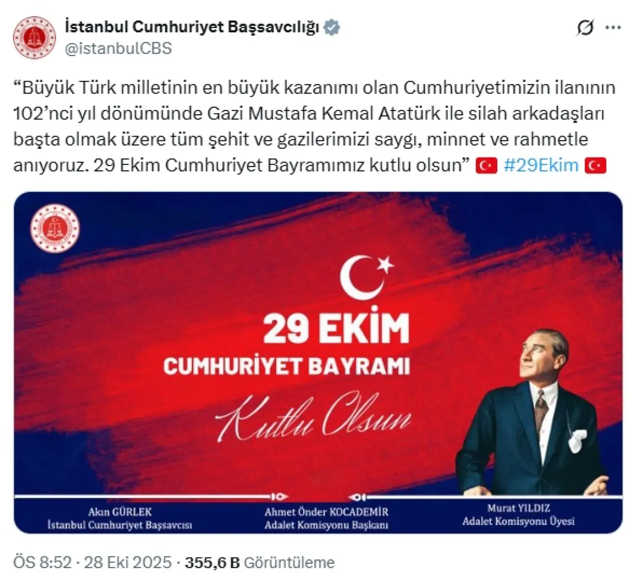 İstanbul Cumhuriyet Başsavcılığı, sosyal medya platformu X'te Ekim 2025 tarihli resmi bir hesap açarak ilk paylaşımını gerçekleştirdi.