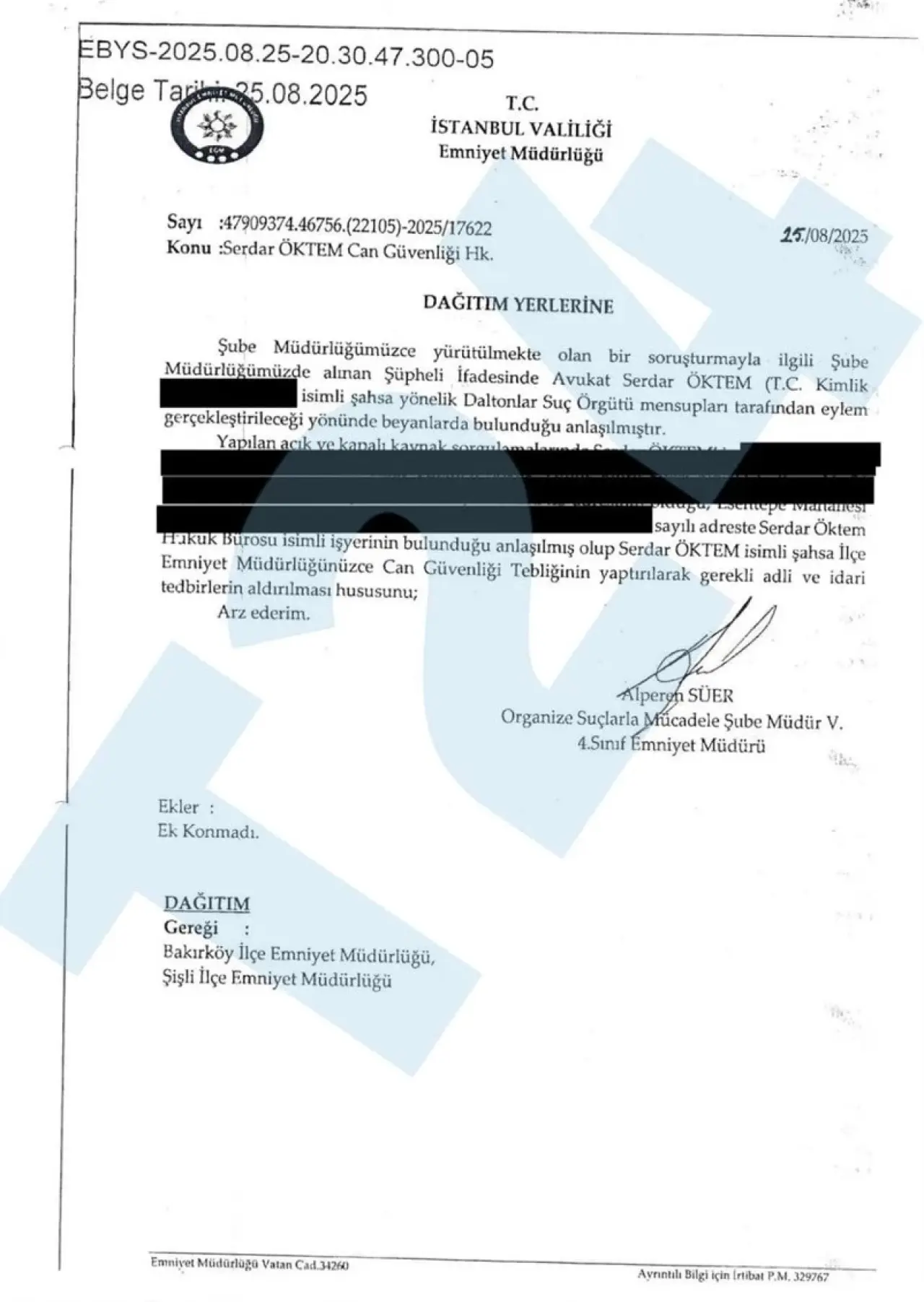 Yazıda, “Şube müdürülüğümüzce yürütülmekte olan bir soruşturmayla ilgili şüpheli ifadesinde avukat Serdar Öktem isimli şahsa yönelik Daltonlar suç örgütü mensupları tarafından eylem gerçekleştirileceği yönünde beyanlarda bulunulduğu anlaşılmıştır.” ifadelerine yer verildi.