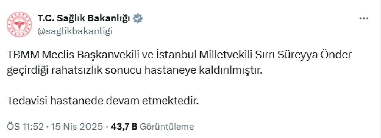 Sağlık Bakanlığı’nın sosyal medya platformu X hesabından yapılan açıklamada, “TBMM Meclis Başkanvekili ve İstanbul Milletvekili Sırrı Süreyya Önder geçirdiği rahatsızlık sonucu hastaneye kaldırılmıştır. Tedavisi hastanede devam etmektedir.” denildi.