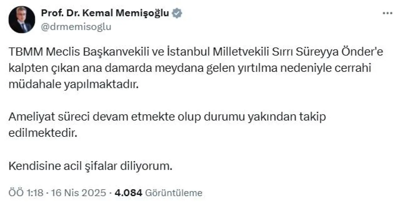 Sırrı Süreyya Önder’in devam eden ameliyatı ve sağlık durumuyla ilgili bilgi veren Sağlık Bakanı Prof. Dr. Kemal Memişoğlu, “Sırrı Süreyya Önder'e kalpten çıkan ana damarda meydana gelen yırtılma nedeniyle cerrahi müdahale yapılmaktadır. Ameliyat süreci devam etmekte olup durumu yakından takip edilmektedir. Kendisine acil şifalar diliyorum.” açıklamasında bulundu.