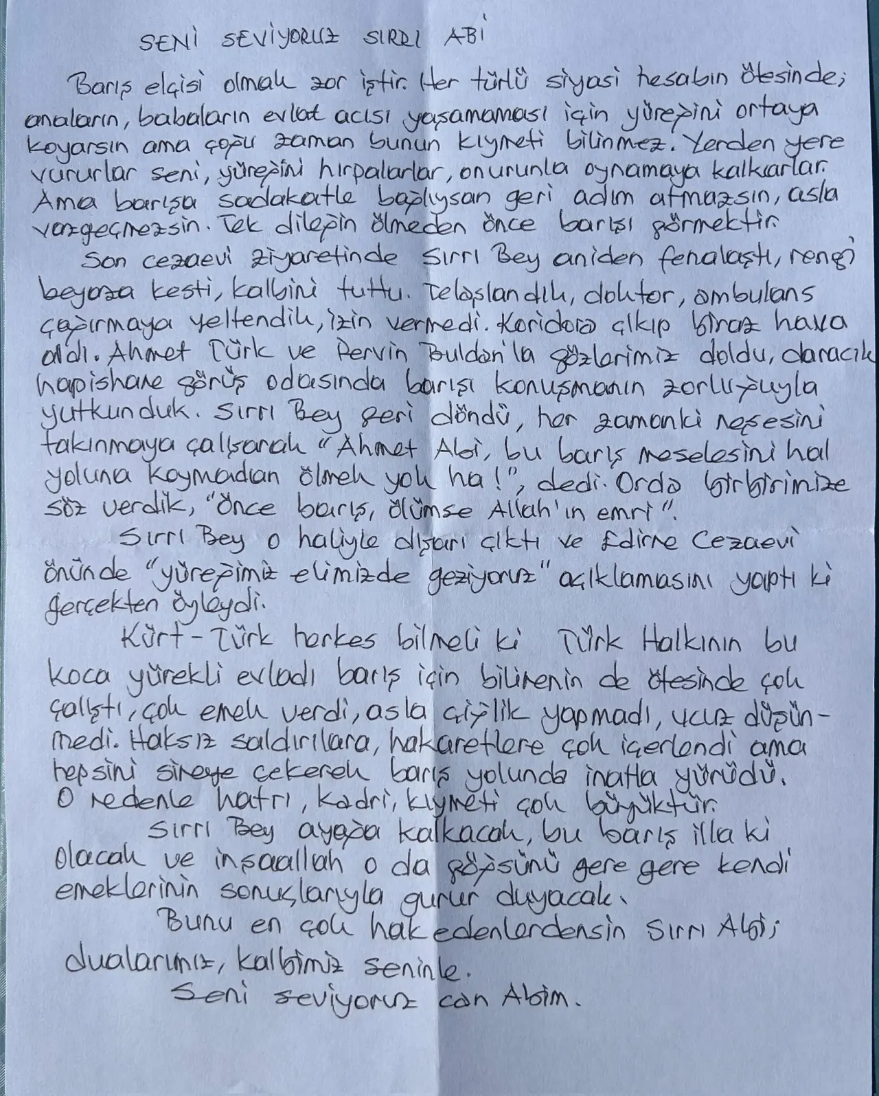 Demirtaş'ın “Seni seviyoruz Sırrı abi” diye başladığı mektup şöyle: