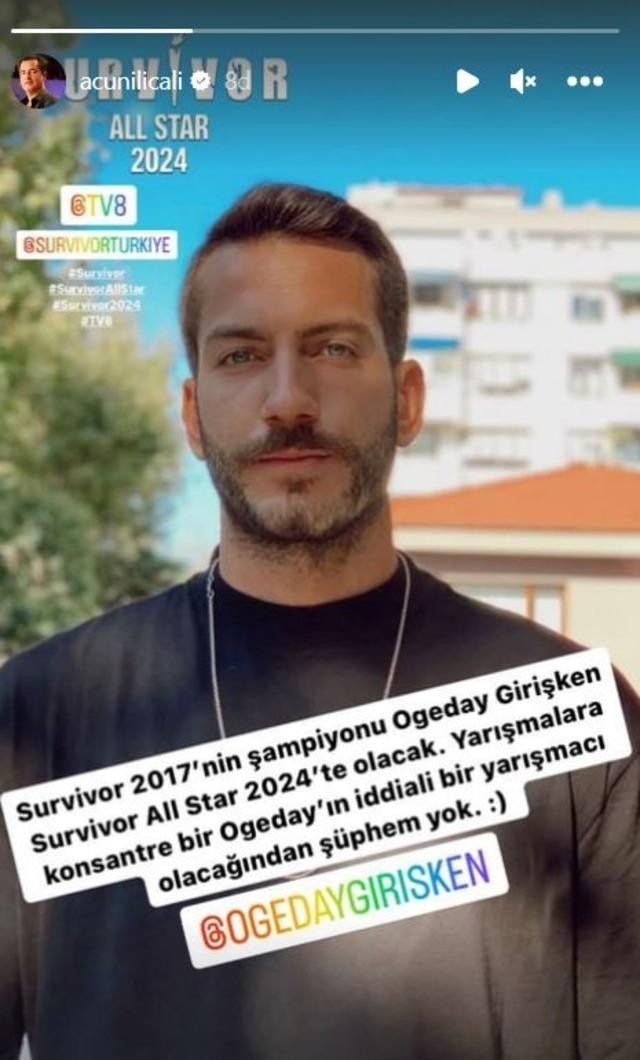 Acun Ilıcalı’nın açıkladığı son isim ise Survivor 2017’nin şampiyonu Ogeday Girişken oldu. Ilıcalı, Ogeday’ın çok iddialı bir yarışmacı olduğunu belirtti. Ogeday, Nisa Bölükbaşı ile yaşadığı aşkla da tanınıyor.