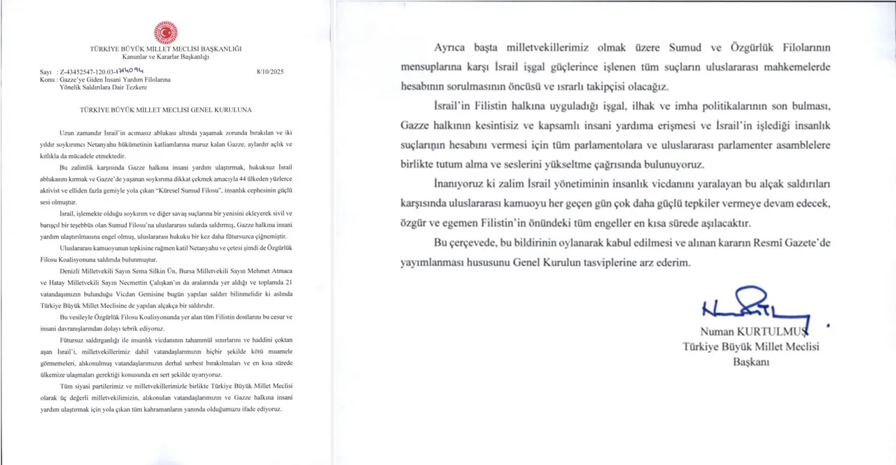 Fütursuz saldırganlığı ile insanlık vicdanının tahammül sınırlarını ve haddini çoktan aşan İsrail’i, milletvekillerimiz dahil vatandaşlarımızın hiçbir şekilde kötü muamele görmemeleri, alıkonulmuş vatandaşlarımızın derhal serbest bırakılmaları ve en kısa sürede ülkemize ulaşmaları gerektiği konusunda en sert şekilde uyarıyoruz. Tüm siyasi partilerimiz ve milletvekillerimizle birlikte Türkiye Büyük Millet Meclisi olarak üç değerli milletvekilimizin, alıkonulan vatandaşlarımızın ve Gazze halkına insani yardım ulaştırmak için yola çıkan tüm kahramanların yanında olduğumuzu ifade ediyoruz. Ayrıca başta milletvekillerimiz olmak üzere Sumud ve Özgürlük Filolarının mensuplarına karşı İsrail işgal güçlerince işlenen tüm suçların uluslararası mahkemelerde hesabının sorulmasının öncüsü ve ısrarlı takipçisi olacağız.