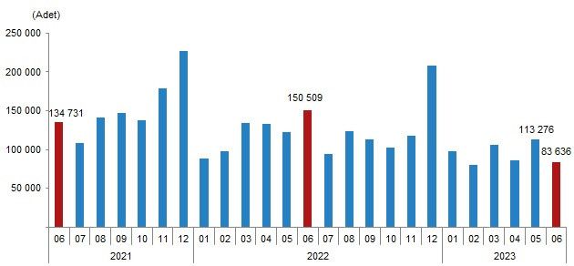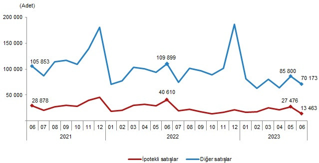 Türkiye genelinde diğer konut satışları haziranda bir önceki yılın aynı ayına göre yüzde 36, 1 azalarak 70 bin 173 oldu. Toplam konut satışları içinde diğer satışların payı yüzde 83, 9 olarak gerçekleşti. Ocak-haziran döneminde gerçekleşen diğer konut satışları ise bir önceki yılın aynı dönemine göre yüzde 20, 1 azalışla 444 bin 249 oldu.