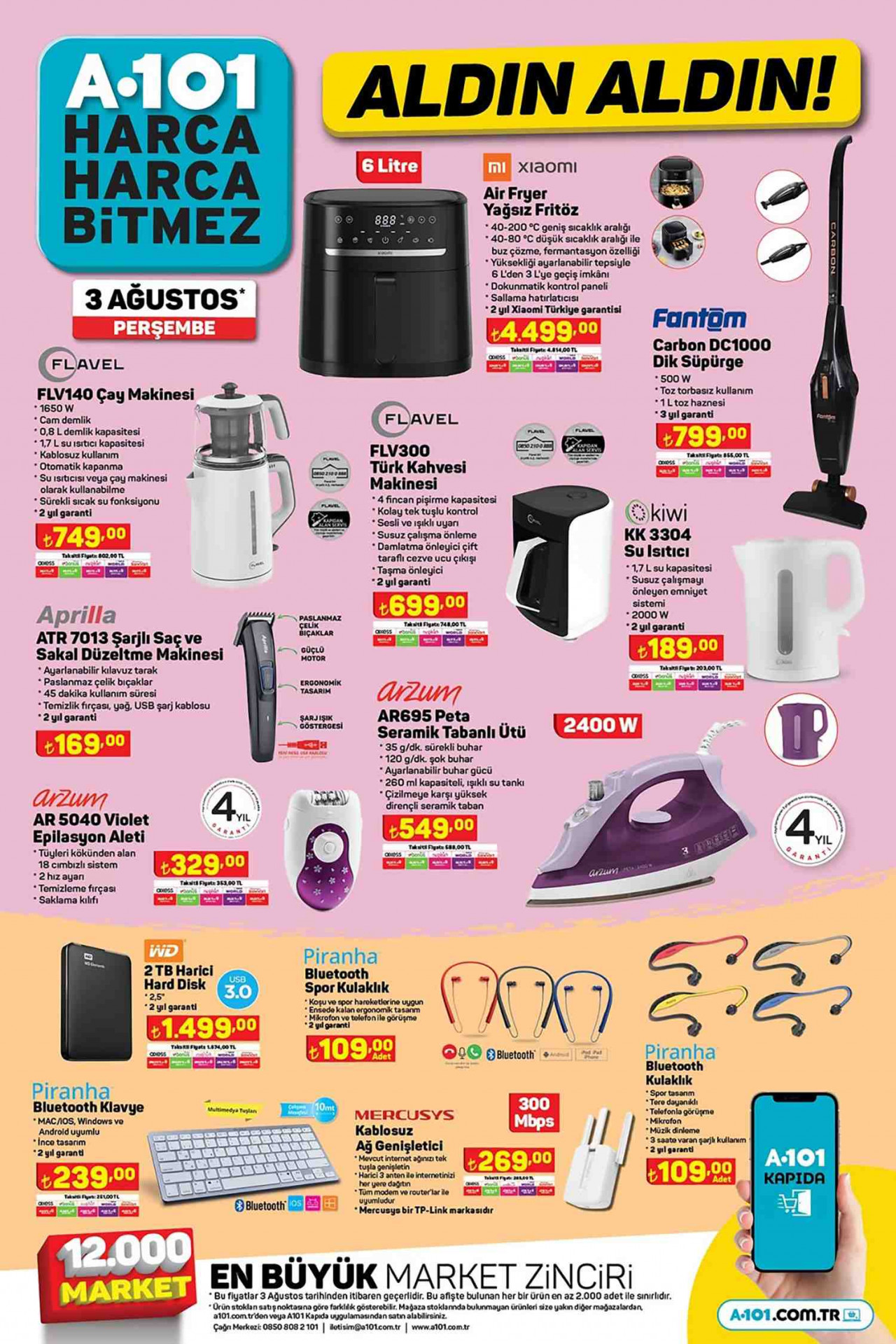 Popüler ürünlerden Xiaomi Air Fryer Yağsız Fritöz 4.499 TL’den satılırken haftanın öne çıkan tüm elektronik ürünleri A101 kampanyasıyla sizleri karşılıyor. Aktüel Ürünler kataloğunda Fantom Carbon DC1000 Dik Süpürge 799 TL, Flavel FLV140 Çay Makinesi 749 TL ve Flavel FLV300 Türk Kahvesi Makinesi 699 TL’den satışa çıkıyor. Bir diğer kampanyada Kiwi KK 3304 Su Isıtıcı 189 TL, Aprilla ATR 7013 Şarjlı Saç ve Sakal Düzeltme Makinesi 169 TL ve Arzum AR695 Peta Seramik Tabanlı Ütü 549 TL fiyatla satılıyor. Günümüzde en değerli varlığımız verilerimiz… Bunları sabit bir diskte tutmak da oldukça önemli. WD 2 TB Harici Hard Disk 1.499 TL fiyatla bu ihtiyacınızı karşılamaya geliyor. Sayfada ayrıca Arzum AR5040 Violet Epilasyon Aleti 329 TL’den satışa çıkıyor. Piranha markalı ürünlerde de indirimler ve kampanyalar var. Bu kapsamda Piranha Bluetooth Spor Kulaklık 109 TL, Piranha Bluetooth Kulaklık 109 TL ve Piranha Bluetooth Klavye 239 TL’den sizleri karşılıyor. Bu kampanyalarda Mercusys Kablosuz Ağ Genişletici 269 TL fiyatla sizleri bekliyor.