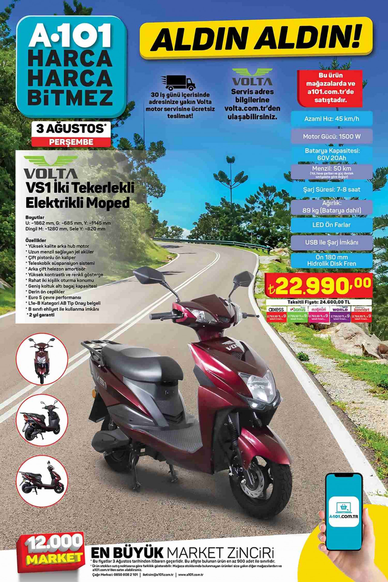 Gerek ihtiyaca yönelik ürünler gerekse bu ürünlerin uygun fiyatlı sunulması A101 3 Ağustos 2023 kataloğunu diğer kataloglara göre öne çıkartacak. 3 Ağustos 2023 A101 Aktüel kataloglarının öne çıkan fırsatları alışveriş tutkunlarını ve ürün beklentisinde olanları sevindiriyor. Volta VS1 İki Tekerlekli Elektrikli Moped 22.990 TL fiyatıyla haftaya damga vuruyor. 45km/s azami hıza sahip olan bu ürün 1500W motor gücüne sahip. 7-8 saat şarj süresiyle dikkat çeken üründe 60V 20Ah batarya bulunuyor. B sınıfı ehliyet ile kullanıma uygun olan ürün 2 yıl garantili. Peki başka ne var?