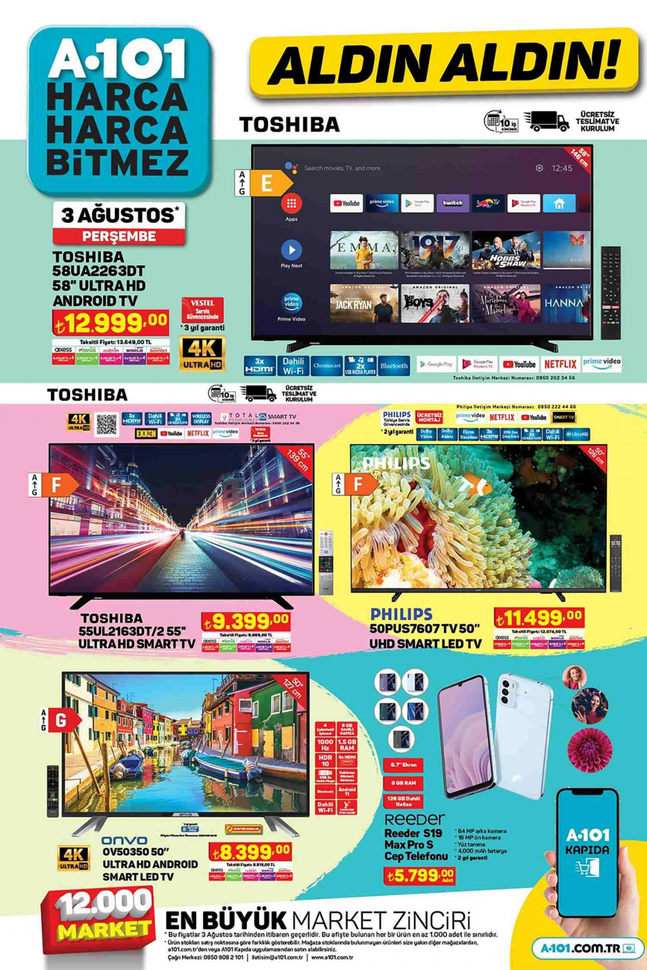 İlk olarak Toshiba 58″ Ultra HD Android Tv 12.999 TL’den geliyor. Bir diğer üründe Toshiba 55″ Ultra HD Smart Tv 9.399 TL’den satılıyor. Ayrıca Philips 50″ UHD Smart Led Tv 11.499 TL fiyatla sizleri bekliyor. Sayfada ONVO 50″ Ultra HD Andrid Smart Led Tv 8.399 TL ve Reeder S19 Max Pro S Cep Telefonu 5.799 TL’den satılıyor.