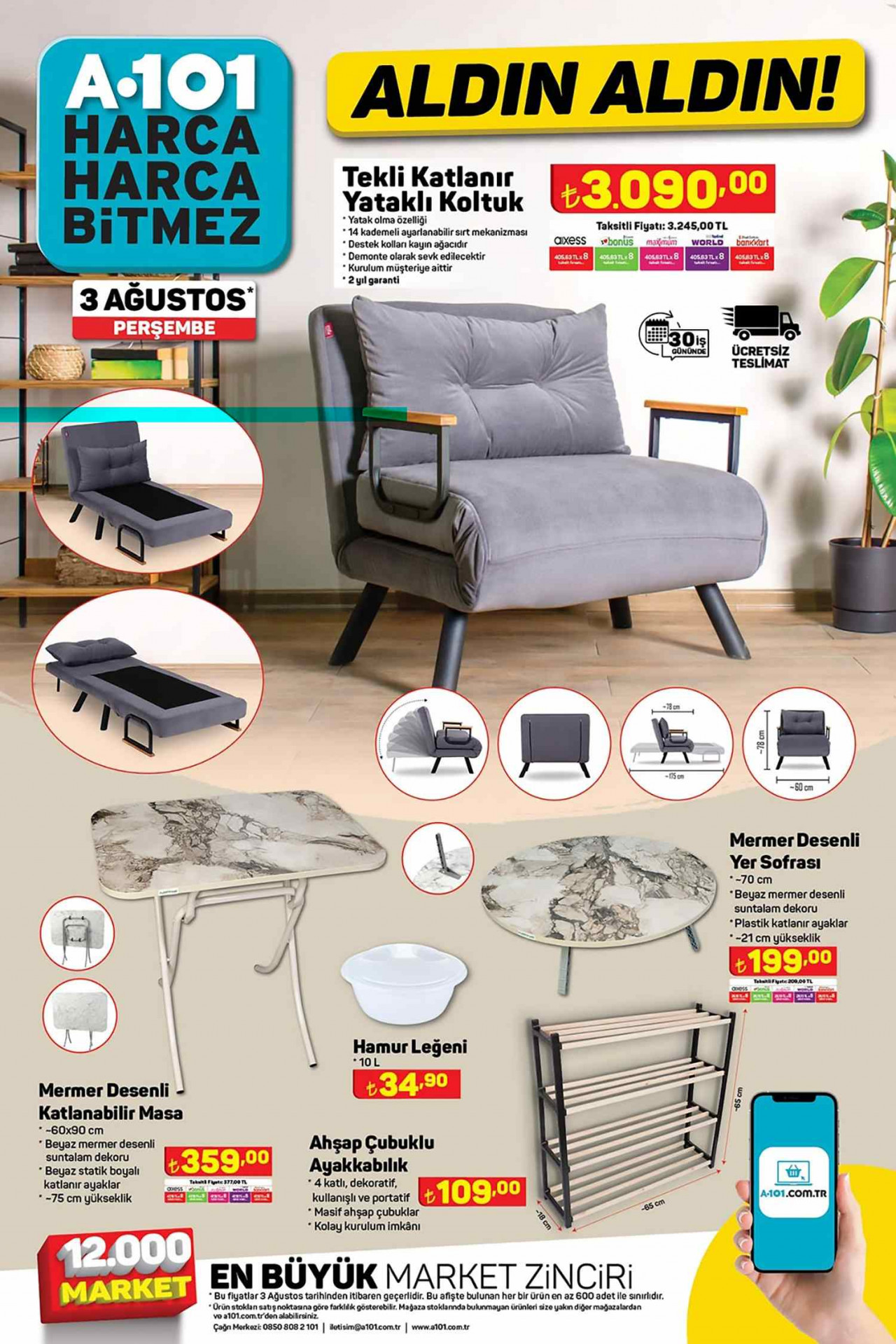 A101 3 Ağustos kataloğunda Tekli Katlanır Yataklı Koltuk 3.090 TL fiyatıyla sizlerle oluyor. Bu ürün yatak olma özelliğine sahip. Hem kompakt bir koltuk hem şipşak açılır bir yatak. 2 fonksiyonu tek bir üründe toplayan bu fırsat, fiyatıyla da öne çıkmakta. Aynı sayfa içinde ayrıca Mermer Desenli Yer Sofrası 70 cm 199 TL, Mermer Desenli Katlanabilir Masa 359 TL2den ve Hamur Leğeni 34, 90 TL’den satılmakta. Ayrıca Ahşap Çubuklu Ayakkabılık 109 TL’den yine sizlerle buluşmakta.