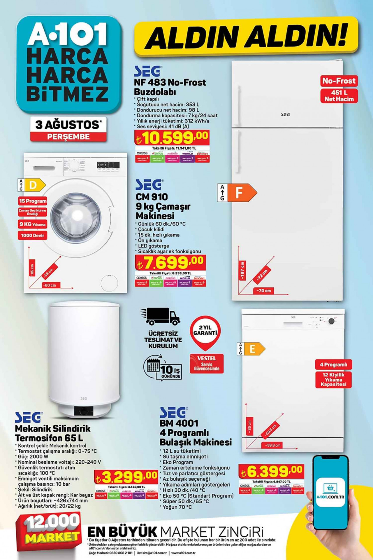 Beyaz eşya ürünlerinde neler yer aldığı hususuyla alakalı ise SEG markalı bazı fırsat ürünleri sizleri bekliyor. Bu kapsamda SEG No-Frost Buzdolabı 10.599 TL, SEG 9 Kg Çamaşır Makinesi 7.699 TL, SEG Mekanik Silindirik Termosifon 3.299 TL ve SEG 4 Programlı Bulaşık Makinesi 6.399 TL’den satışa çıkıyor.