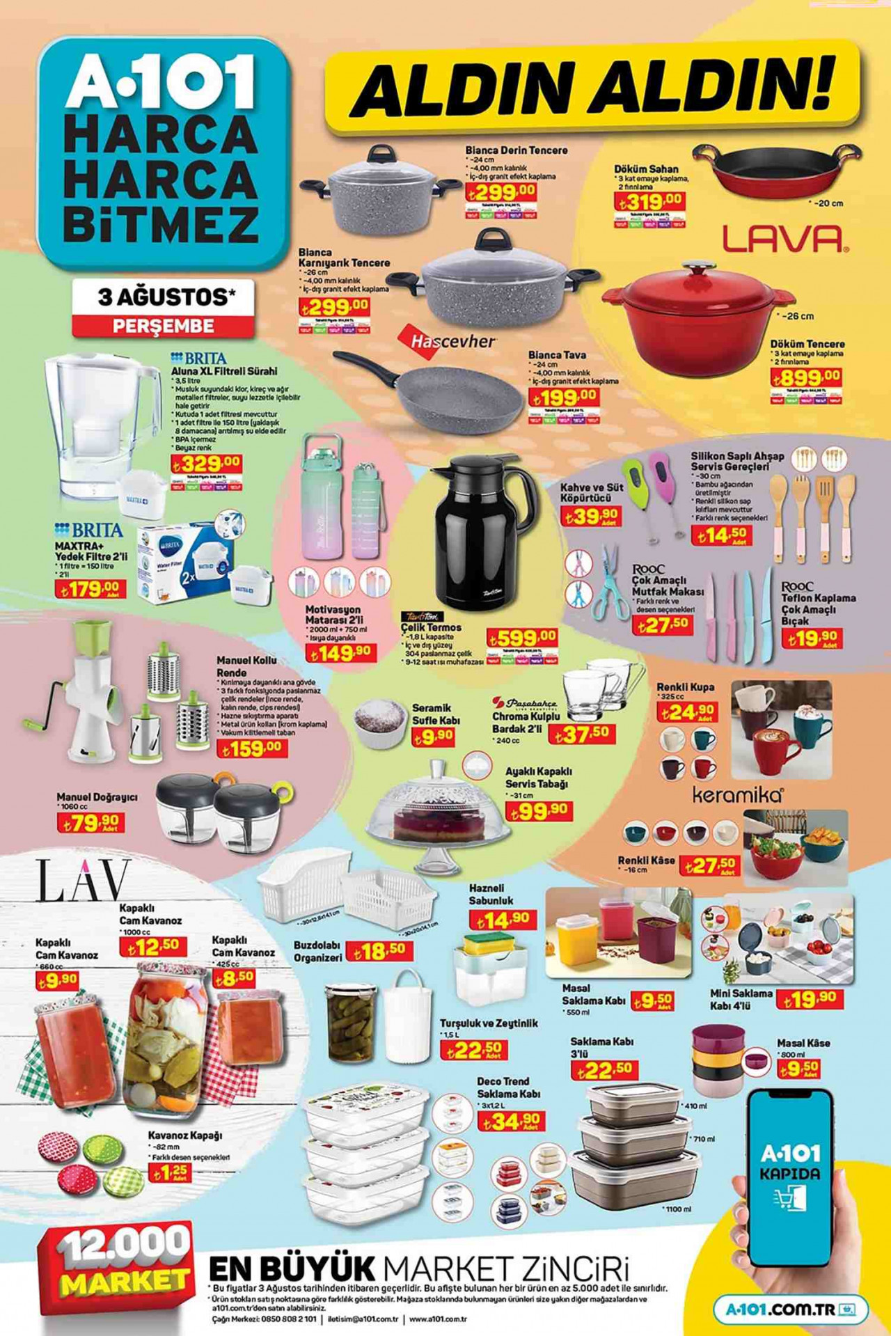 A101 Aktüel Kataloğu 3 Ağustos 2023 fırsatları dikkat çekici fırsatlarını açıklamayı sürdürüyor. Mutfakta olmazsa olmazınız züccaciye ürünleri A101 3 Ağustos kataloğuyla geliyor. Fırsat ürünleri müşterisini Hascevher Bianca Derin Tencere ile karşılıyor. 299 TL fiyata sahip olan bu ürünü Hascevher Bianca Karnıyarık Tencere 299 TL’den ve Hascevher Bianca Tava 199 TL’den takip ediyor. Döküm mutfak ürünlerinin en iyilerinden LAVA Döküm Sahan 319 TL ve LAVA Döküm Tencere 899 TL’den sizlerle buluşuyor. Bu harika ürünleri kullanışlı yapısıyla dikkat çeken Brita Aluna XL Filtreli Sürahi 329 TL ve Brita Maxtra + Yedek Filtre 2’li 179 TL takip ediyor. Birbirinden özel ve güzel ürünlerde Motivasyon Matarası 2’li 149 TL, Çelik Termos 1, 8 Litre 599 TL ve Kahve ve Süt Köpürtücü 39, 90 TL’den satılıyor. Aktüel Ürün raflarında yer edinen Silikon Saplı Ahşap Servis Gereçleri 14, 50 TL adet fiyatıyla satılırken Rooc Çok Amaçlı Mutfak Makası 27, 50 TL ve Rooc Teflon Kaplama Çok Amaçlı Bıçak 19, 90 TL’den satılıyor. Bu haftanın bir diğer ürününde Manuel Kollu Rende 159 TL, Seramik Sufle Kabı 9, 90 TL ve Paşabahçe Chroma Kulplu Bardak 2’li 37, 50 TL’den sizlerle oluyor. Görüldüğü üzere A101 Kataloğu zücacciye ürünleri kapsamında müşterisine güzel bir alışveriş deneyimi yaşatacak.