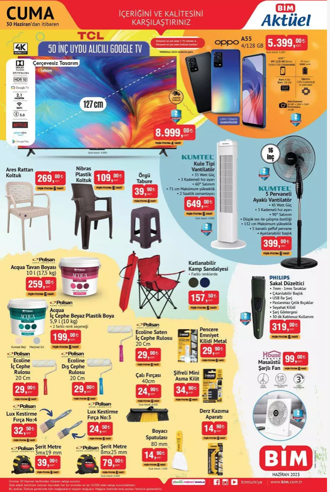 Bunun yanı sıra, BİM'in aktüel ürünler kataloğunda vantilatörlerin de yer aldığı görülüyor. Yaz aylarında serinlemek için ihtiyaç duyulan vantilatörler, sadece 399 TL'ye alıcılara sunulacak. Bu fiyatlar, tüketicilerin bütçelerine dost ve kaliteli bir seçenek sunuyor.