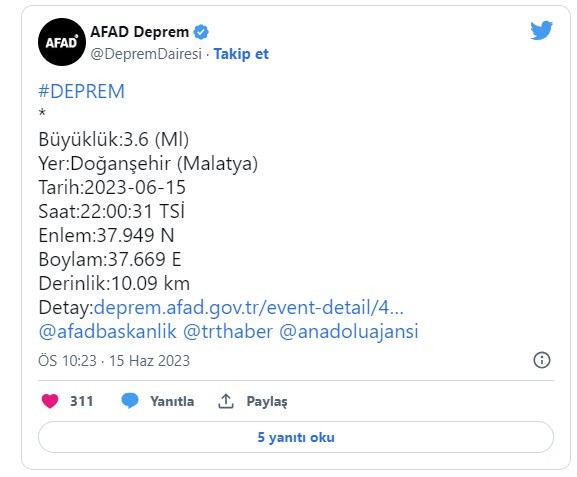 Kahramanmaraş'ta 6 Şubat'ta meydana gelen iki büyük depremin ardından bölgede artçılar devam ediyor. Son olarak saat 22.00'de Malatya Doğanşehir'de 3.6 büyüklüğünde bir deprem meydana geldi. AFAD depremin derinliğini 10 km olarak duyurdu.