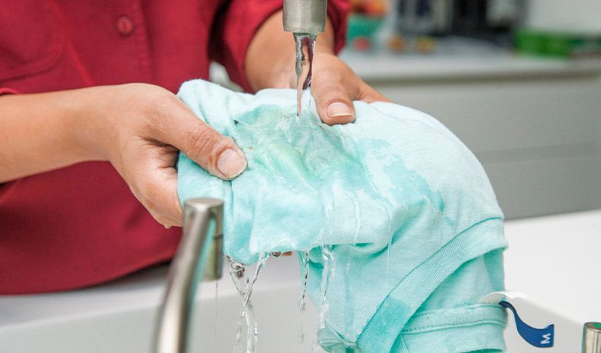 Daha sonra yaklaşık 30 dakika kadar beklettiğimiz kıyafeti soğuk su ile duruluyoruz. Sonra da hep yıkadığımız ayarda çamaşır makinesinde yıkıyoruz.