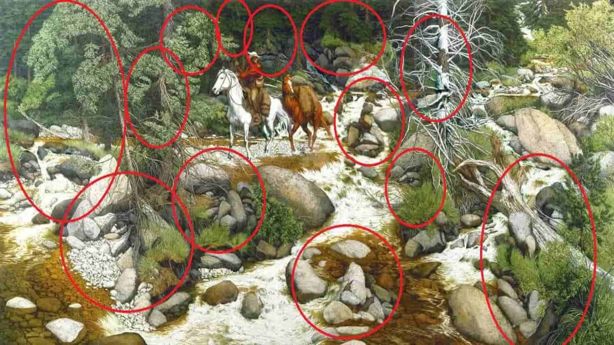 Yukarıdaki resimde bir adam ve iki atın olduğu bir orman sahnesi görülmektedir. Ancak göz önünde saklanan başka bir şey daha vardır. Bu resim aslında ünlü Amerikalı ressam Bev Doolittle'ın ''Ormanın Gözleri Var'' adlı bir resmidir. Okuyuculara sunulan zorluk çok basittir.