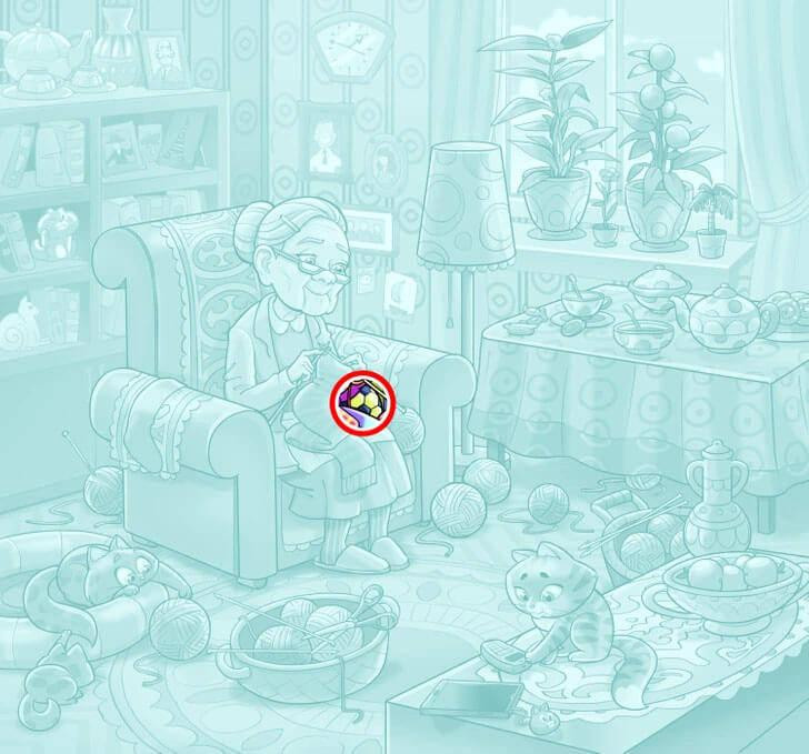 Yukarıdaki zekâ testi görselinde bir ev ve örgü yapan bir yaşlı teyze görüyoruz. Evin içerisinde kediler ve bir sürü ip yumağı bulunuyor. Kedilerden biri bir yumakla diğeri telefon ile oynuyor. Masanın üzerinde birkaç atıştırmalık ve çay fincanı var.
