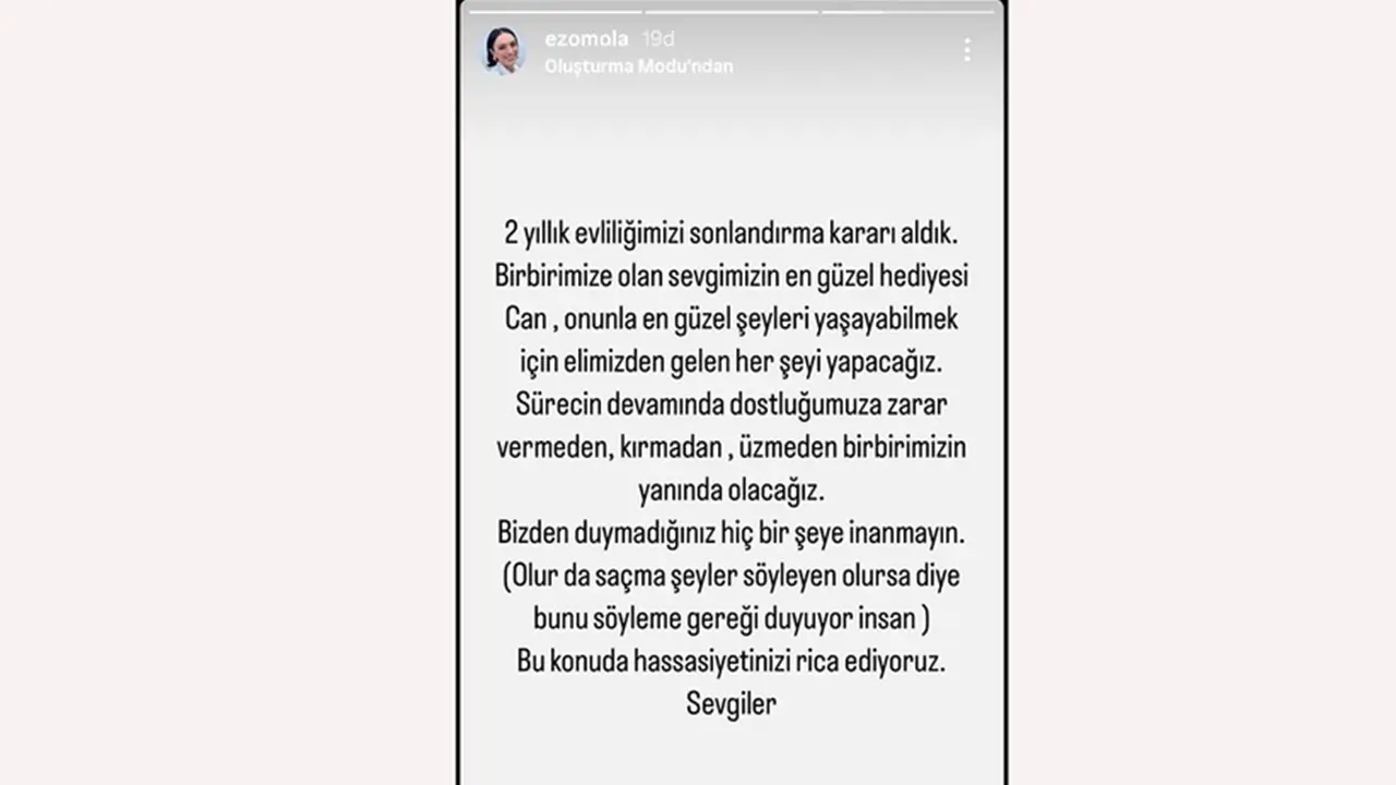 4 yıl sevgili kalan oyuncu Ezgi Mola ile işletmeci Mustafa Aksakallı 2023 yılında dünya evine girmişti. Bu birliktelikten “Can” isminde bir çocuk sahibi olan ünlü oyuncu Ezgi Mola, sosyal medya hesabından sevenlerini şaşırtan bir kararı duyurdu. Mola, 2 yıllık evliliğini sonlandırma kararı aldıklarını açıkladı.
