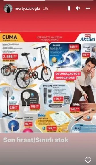 Marketin söz konusu shoplu görseline kendi fotoğrafını ekleyen Mert Yazıcıoğlu, “aktör, sınırlı stok” notunu düştü.
