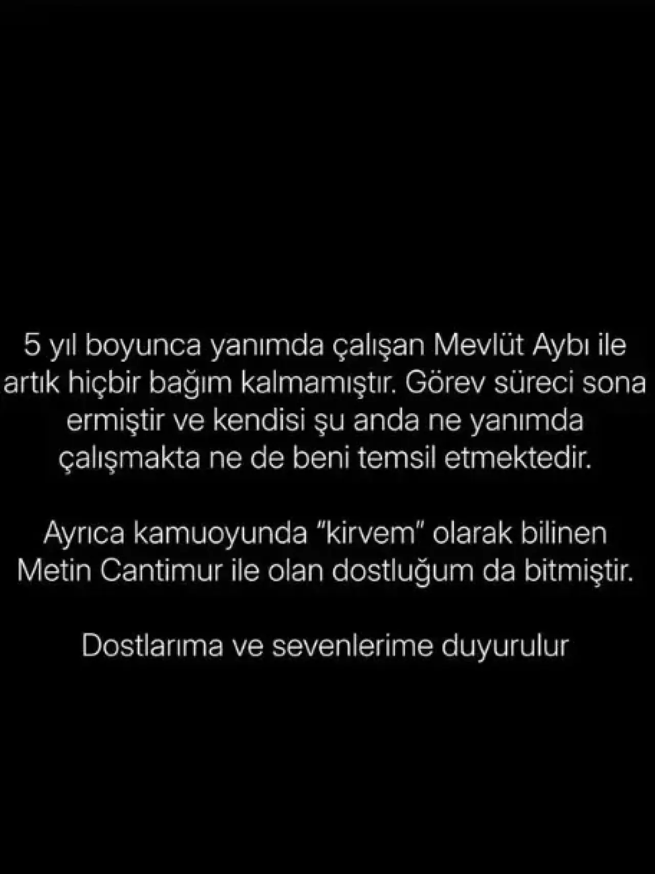 “5 yıl boyunca yanımda çalışan Mevlüt Aybı ile artık hiçbir bağım kalmamıştır. Görev süreci sona ermiştir ve kendisi şu anda ne yanımda çalışmakta ne de beni temsil etmektedir. Ayrıca kamuoyunda 'kirvem' olarak bilinen Metin Cantimur ile olan dostluğum da bitmiştir. Dostlarıma ve sevenlerime duyurulur.”
