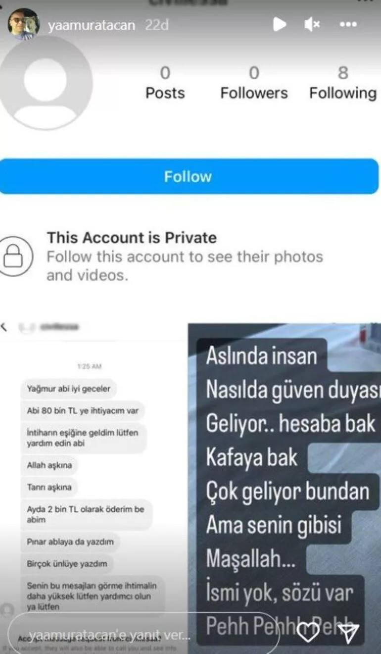 Yağmur Atacan’dan para isteyen bir sosyal medya kullanıcısı, şu ifadeleri kullandı: “Yağmur abi iyi geceler, abi 80 bin TL’ye ihtiyacım var. İntiharın eşiğine geldim, lütfen yardım edin abi. Allah aşkına. Ayda 2 bin TL olarak öderim be abim. Pınar ablaya da yazdım, başka ünlülere de yazdım. Senin bu mesajları görme ihtimalin daha yüksek lütfen yardımcı olun.”