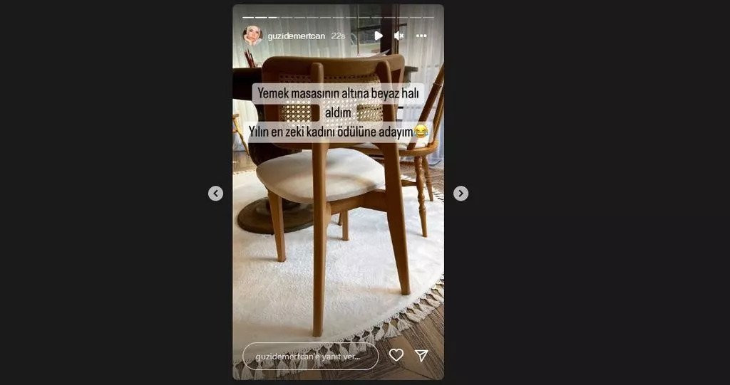 Geçtiğimiz günlerde sosyal medya hesabının hikayeler kısmından yeni bir paylaşım yapan Güzide Mertcan, yemek masasının altına yeni bir beyaz halı aldığını gösterdi. Takipçileri ile alışverişini paylaşan Mertcan fotoğrafa, “yemek masasının altına beyaz halı aldığım için yılın en zeki kadını ödülünü kendime veriyorum” notunu düştü.