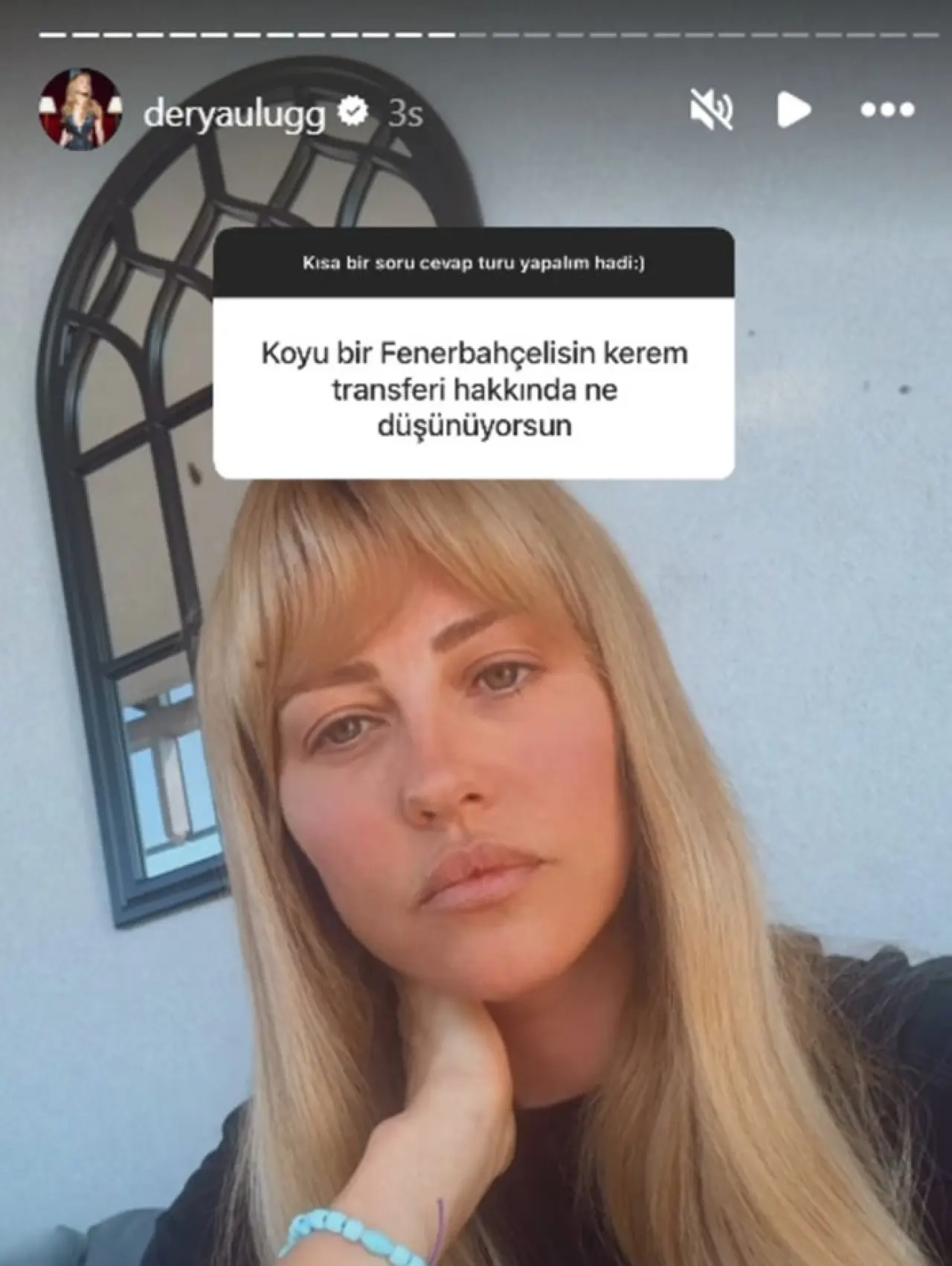 Ünlü şarkıcı Derya Uluğ ise kendisine Instagram üzerinden gelen, “Koyu bir Fenerbahçelisin, Kerem transferi hakkında ne düşünüyorsun?” sorusuna dikkat çeken bir cevap verdi.