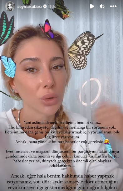 Sosyal medya platformu Instagram'dan yaptığı paylaşımda, aşk haberlerin doğru olmadığını ifaden eden Şeyma Subaşı, bekar olduğu için herkesle ilişkilendirilmemesi gerektiğini söyledi.
