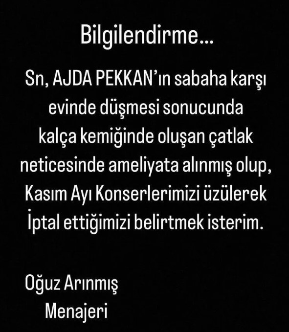 Konu hakkında açıklama ise Ajda Pekkan'ın menajeri Oğuz Arınmış tarafından yapıldı. Arınmış yaptığı paylaşımda süper starın evinde geçirdiği kaza sonucunda düştüğünü ve kalça kemiğinden çatlak oluştuğunu, bu nedenle ameliyata girdiğini duyurarak rahatsızlığı nedeniyle Kasım ayı konserlerinin iptal edildiğini duyurdu. Böylelikle Ajda Pekkan'ın Kasım ayı konser programı belirlenecek yeni bir tarihe kadar iptal edilmiş oldu. Kasım ayında ünlü ismin pek çok sahne programına çıkması bekleniyordu.