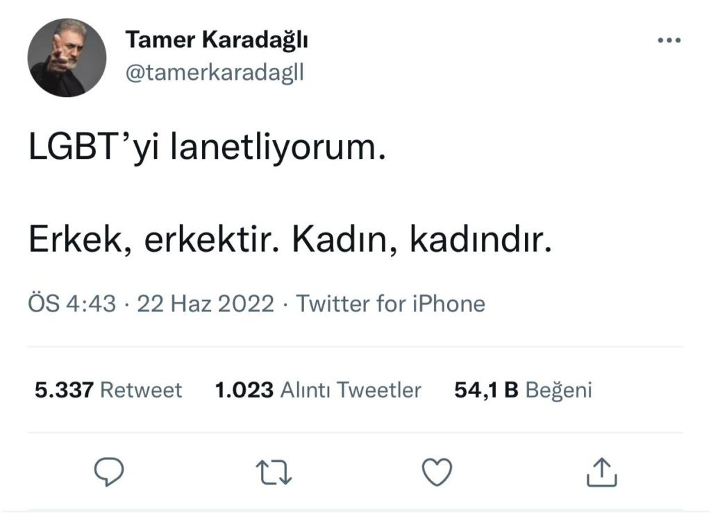 Arka arkaya paylaşımlar yapan Tamer Karadağlı, “LGBT’yi lanetliyorum, erkek erkektir kadın kadındır” ifadelerini kullandı.