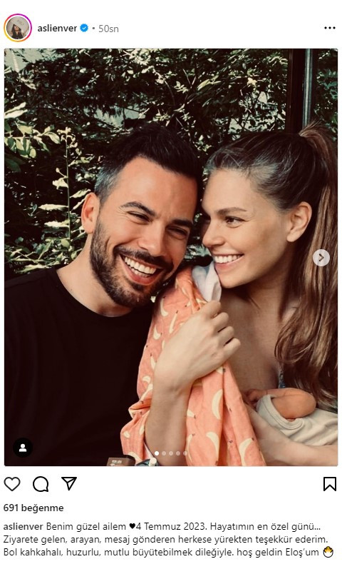 4 Temmuz'da Elay adını verdiği kızını kucağına alan güzel oyuncu Aslı Enver, sosyal medya hesabından eşi ve bebeğiyle fotoğrafını paylaşarak "Hayatımın en özel günü. Bol kahkahalı, huzurlu, mutlu büyütebilmek dileğiyle. Hoş geldin Eloşum" dedi.
