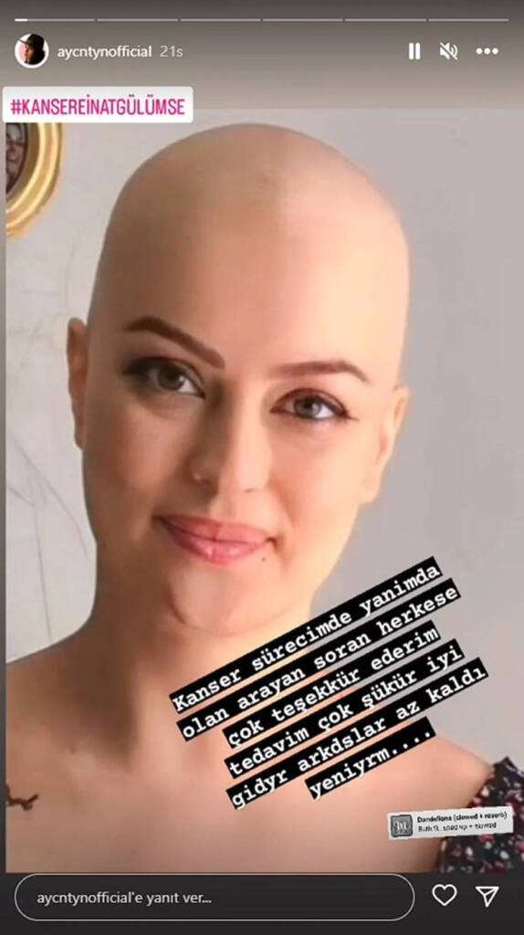 Instagram hesabından, "Kansere inat gülümse" notuyla peruksuz bir fotoğrafını paylaşan Ayçin Tuyun'un açıklaması şöyle: