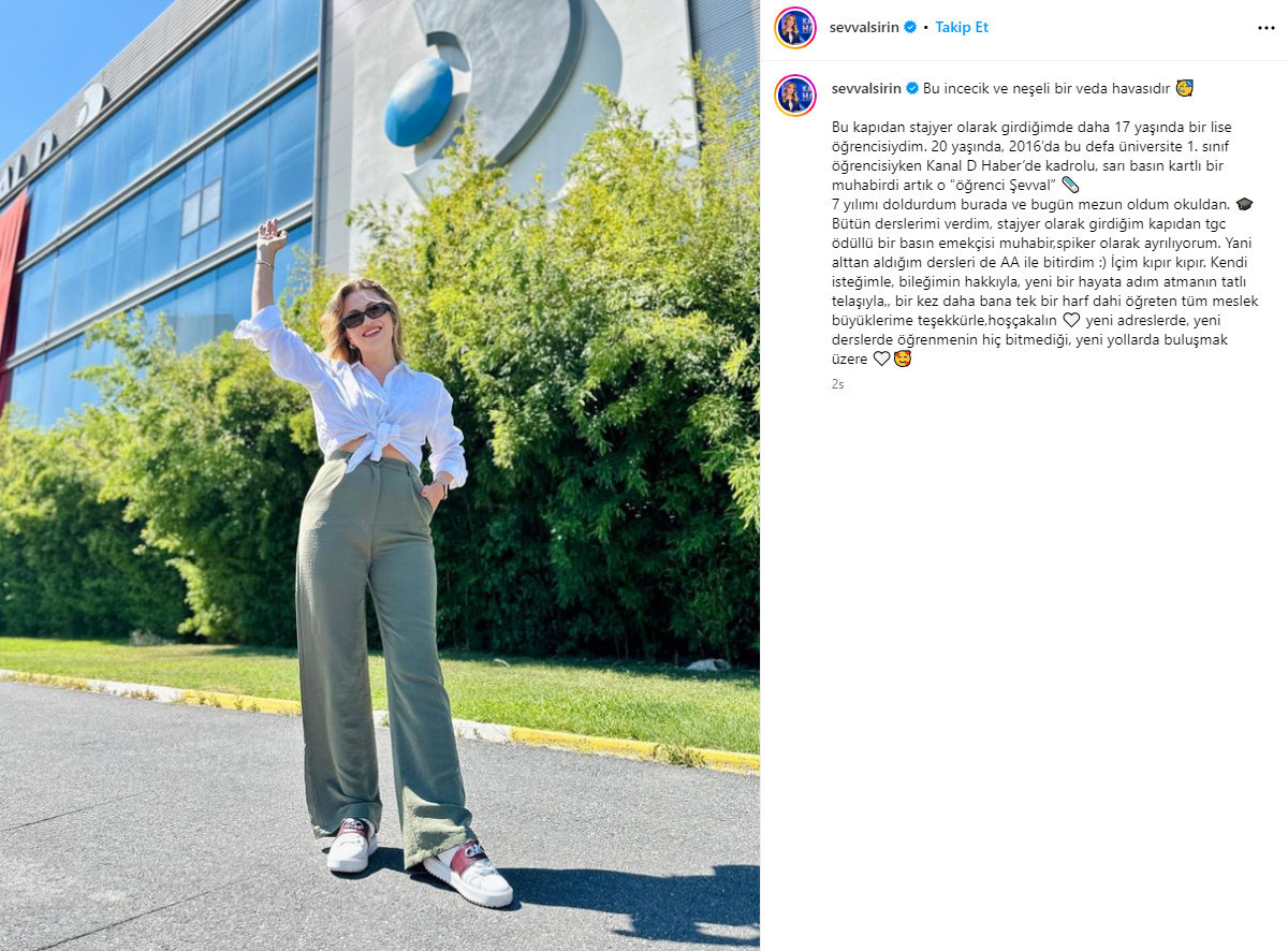 Şirin paylaşımında, “Bu incecik ve neşeli bir veda havasıdır Bu kapıdan stajyer olarak girdiğimde daha 17 yaşında bir lise öğrencisiydim. 20 yaşında, 2016’da bu defa üniversite 1. sınıf öğrencisiyken Kanal D Haber’de kadrolu, sarı basın kartlı bir muhabirdi artık o “öğrenci Şevval” 7 yılımı doldurdum burada ve bugün mezun oldum okuldan. Bütün derslerimi verdim, stajyer olarak girdiğim kapıdan TGC ödüllü bir basın emekçisi muhabir, spiker olarak ayrılıyorum. Yani alttan aldığım dersleri de AA ile bitirdim :) İçim kıpır kıpır. Kendi isteğimle, bileğimin hakkıyla, yeni bir hayata adım atmanın tatlı telaşıyla, bir kez daha bana tek bir harf dahi öğreten tüm meslek büyüklerime teşekkürle, hoşçakalın yeni adreslerde, yeni derslerde öğrenmenin hiç bitmediği, yeni yollarda buluşmak üzere” ifadelerini kullandı.