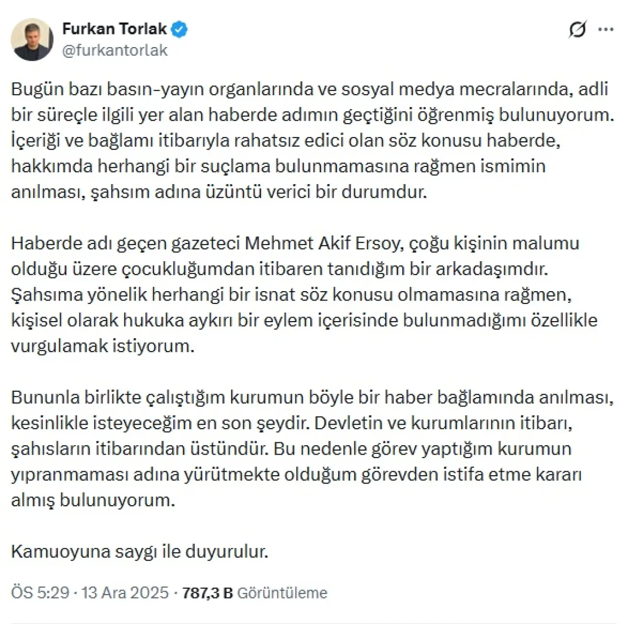 Torlak'ın sosyal medya paylaşımından yaptığı istifa açıklaması şöyle:
