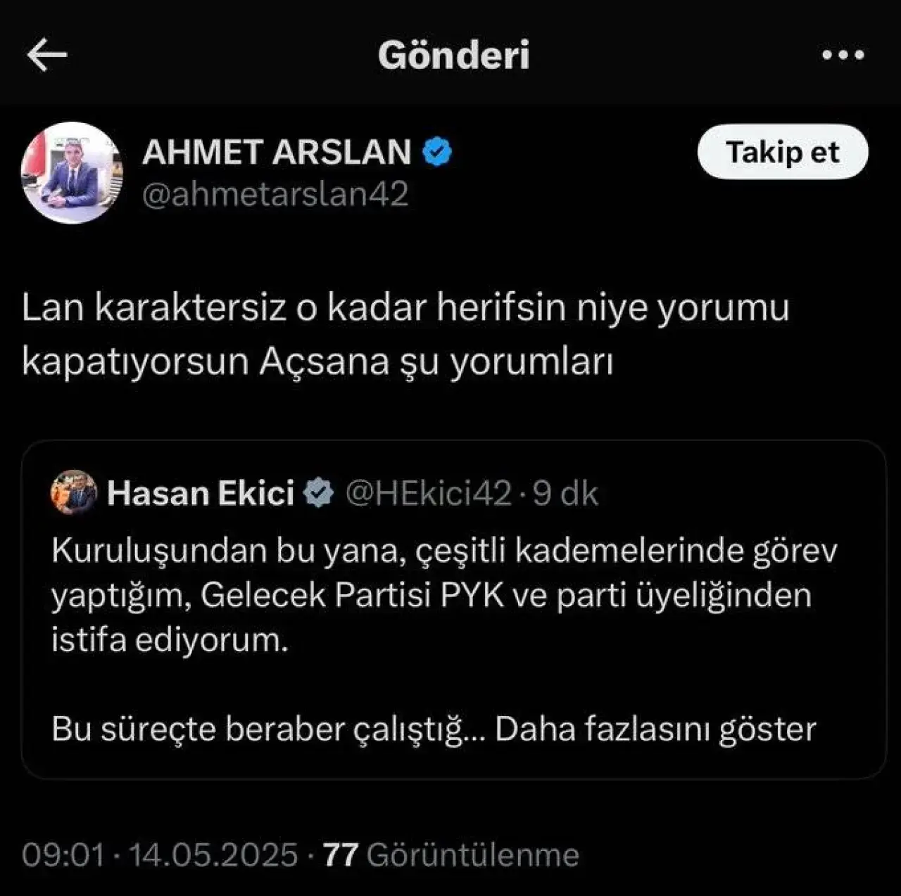 Gelecek Partisi’nden istifa eden Konya Milletvekili Hasan Ekici’ye, partinin Konya İl Başkanı Ahmet Arslan, X hesabından, “Lan karaktersiz o kadar herifsin niye yorumu kapatıyorsun. Açsana şu yorumları.” ifadeleriyle sert tepki gösterdi.