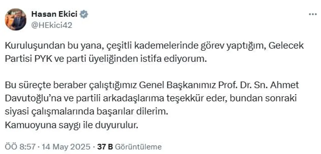 Gelecek Partisi Konya Milletvekili Hasan Ekici partideki görevlerinden ve üyelikten istifa etti.