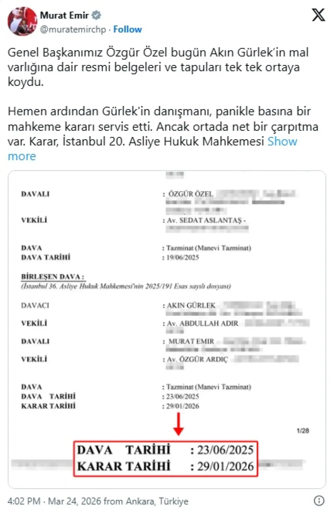 Cumhuriyet Halk Partisi (CHP) Ankara Milletvekili ve Grup Başkanvekili Murat Emir, sosyal medya platformu X hesabından Adalet Bakanı Akın Gürlek'in kendisi ve CHP Genel Başkanı Özgür Özel'in Haziran 2025'te yaptığı konuşmalarla ilgili açtığı manevi tazminat davasını kazanmasına ilişkin açıklama yaptı.