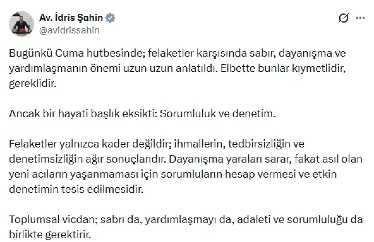 “Bugünkü Cuma hutbesinde; felaketler karşısında sabır, dayanışma ve yardımlaşmanın önemi uzun uzun anlatıldı. Elbette bunlar kıymetlidir, gereklidir. Ancak bir hayati başlık eksikti: Sorumluluk ve denetim. Felaketler yalnızca kader değildir; ihmallerin, tedbirsizliğin ve denetimsizliğin ağır sonuçlarıdır. Dayanışma yaraları sarar, fakat asıl olan yeni acıların yaşanmaması için sorumluların hesap vermesi ve etkin denetimin tesis edilmesidir. Toplumsal vicdan; sabrı da, yardımlaşmayı da, adaleti ve sorumluluğu da birlikte gerektirir.”
