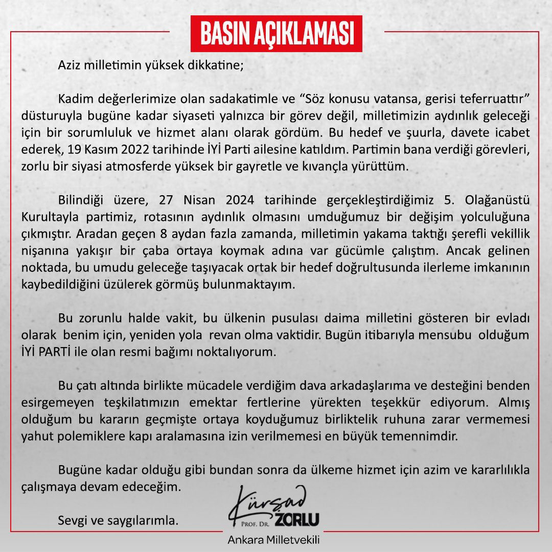 Ankara Milletvekili Kürşad Zorlu paylaşımında İYİ Parti ile resmi bağının noktaladığını belirterek, “Ortak bir hedef doğrultusunda ilerleme imkanının kaybedildiğini üzülerek görmüş bulunmaktayım.” dedi.
