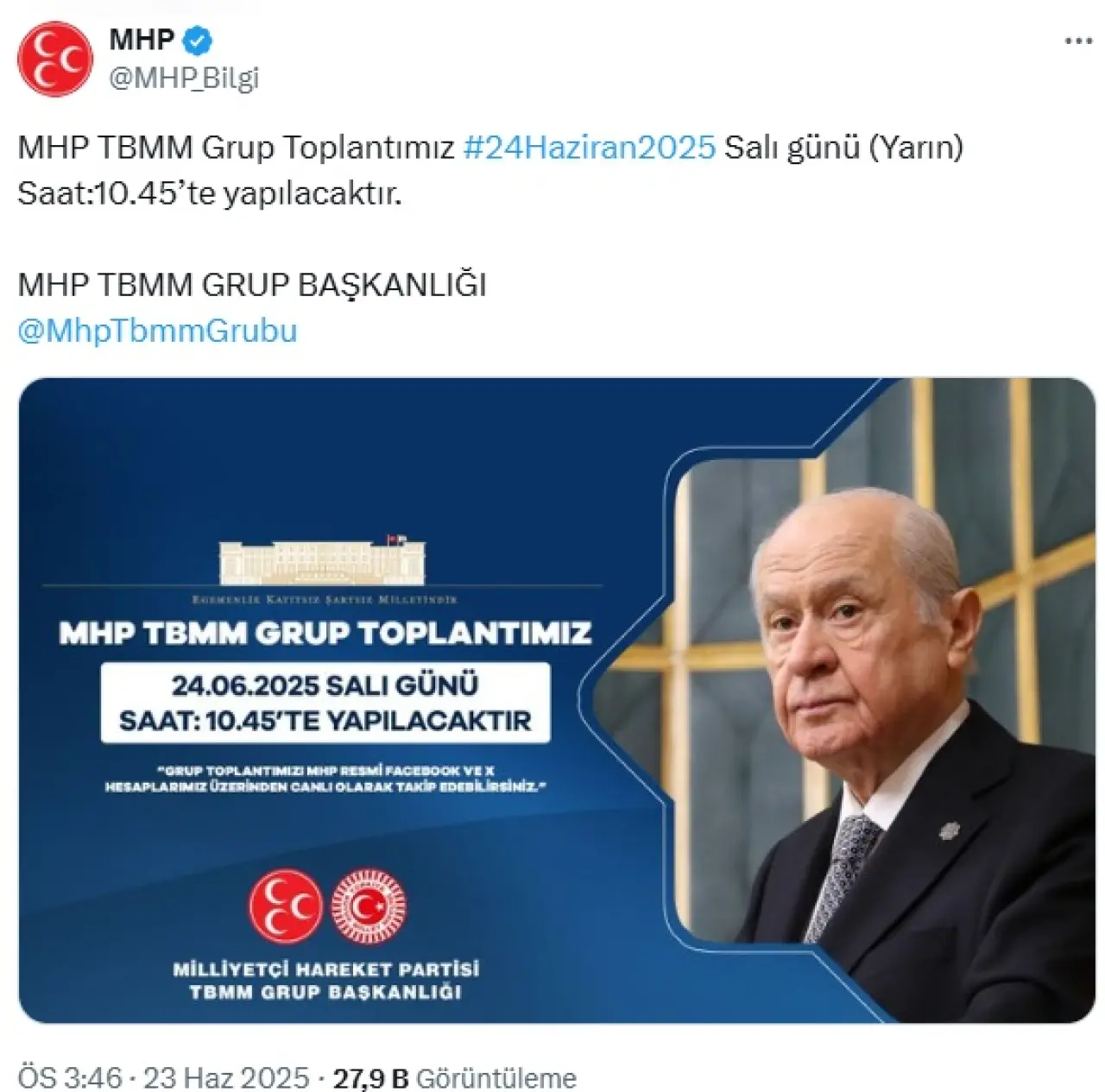 MHP'nin resmi sosyal medya hesabından yapılan duyuruda, “MHP TBMM Grup Toplantımız 24 Haziran 2025 Salı günü (Yarın) Saat: 10.45’te yapılacaktır.” ifadeleri yer aldı.