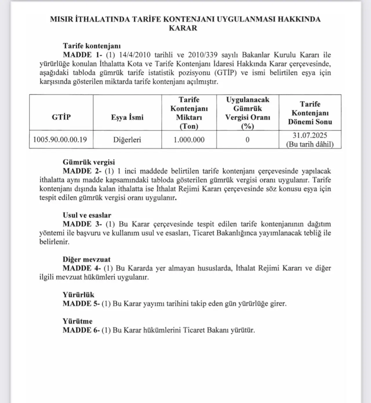Resmi Gazete'de yayımlanan Cumhurbaşkanı kararı ile gümrüksüz bir milyon ton mısır ithalatına izin verildi.