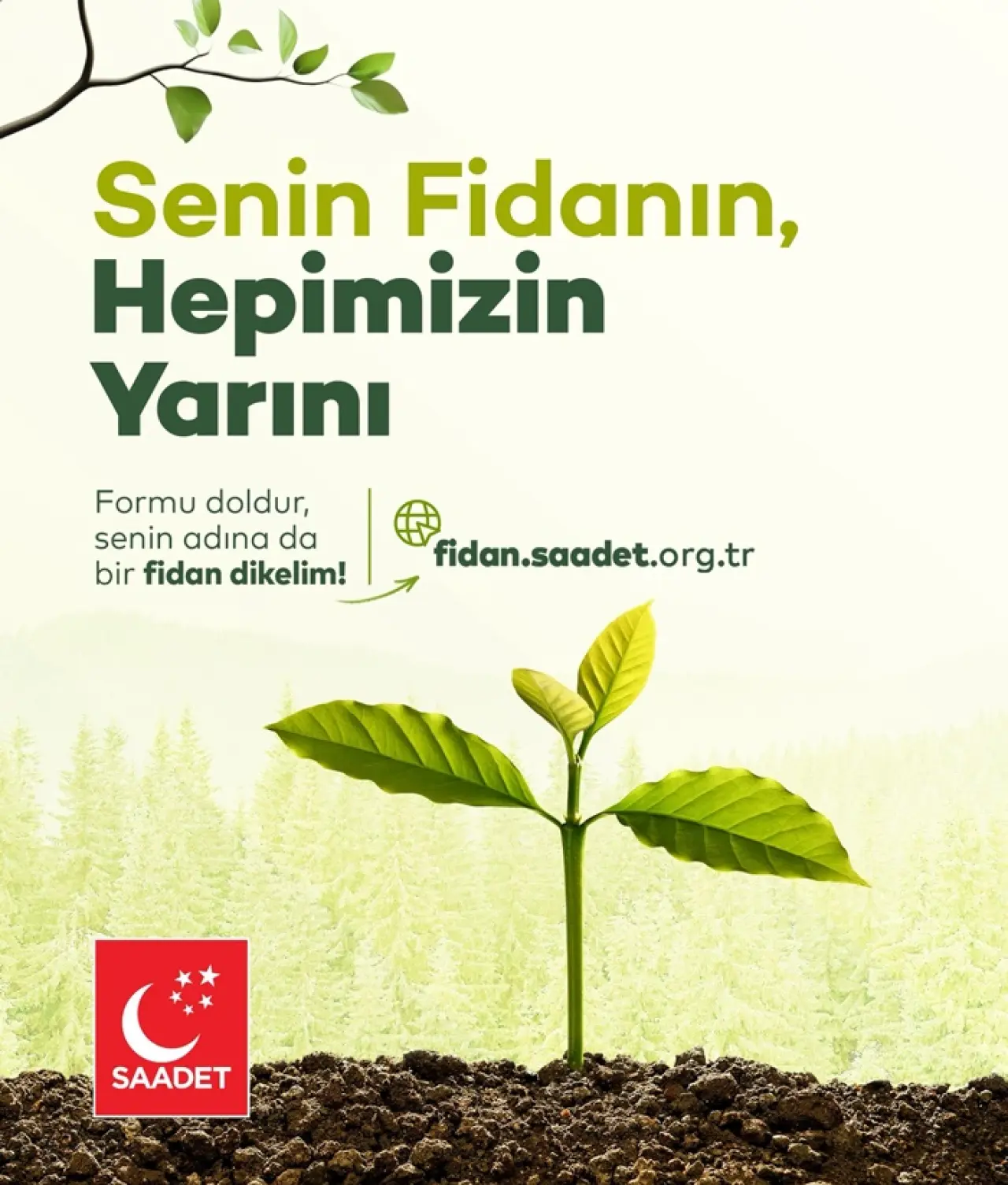 Bu kapsamda “fidan.saadet.org.tr” adıyla internet sitesi açıldı. Siteye giriş yapan vatandaşlar, “Bir Fidan da Senin İçin Dikelim” başlığı altında önlerine çıkan formu doldurarak, adlarına fidan dikilmesini talep edebilecek. Diğer yandan Saadet Partisi’nin Türkiye’nin dört bir yanını kapsayan fidan dikme seferberliği doğrultusunda toprakla buluşturulacak ilk fidanlara, orman yangınlarıyla mücadele ederken şehit düşen işçilerin, AKUT görevlilerinin ve vatandaşların isimleri verilecek.