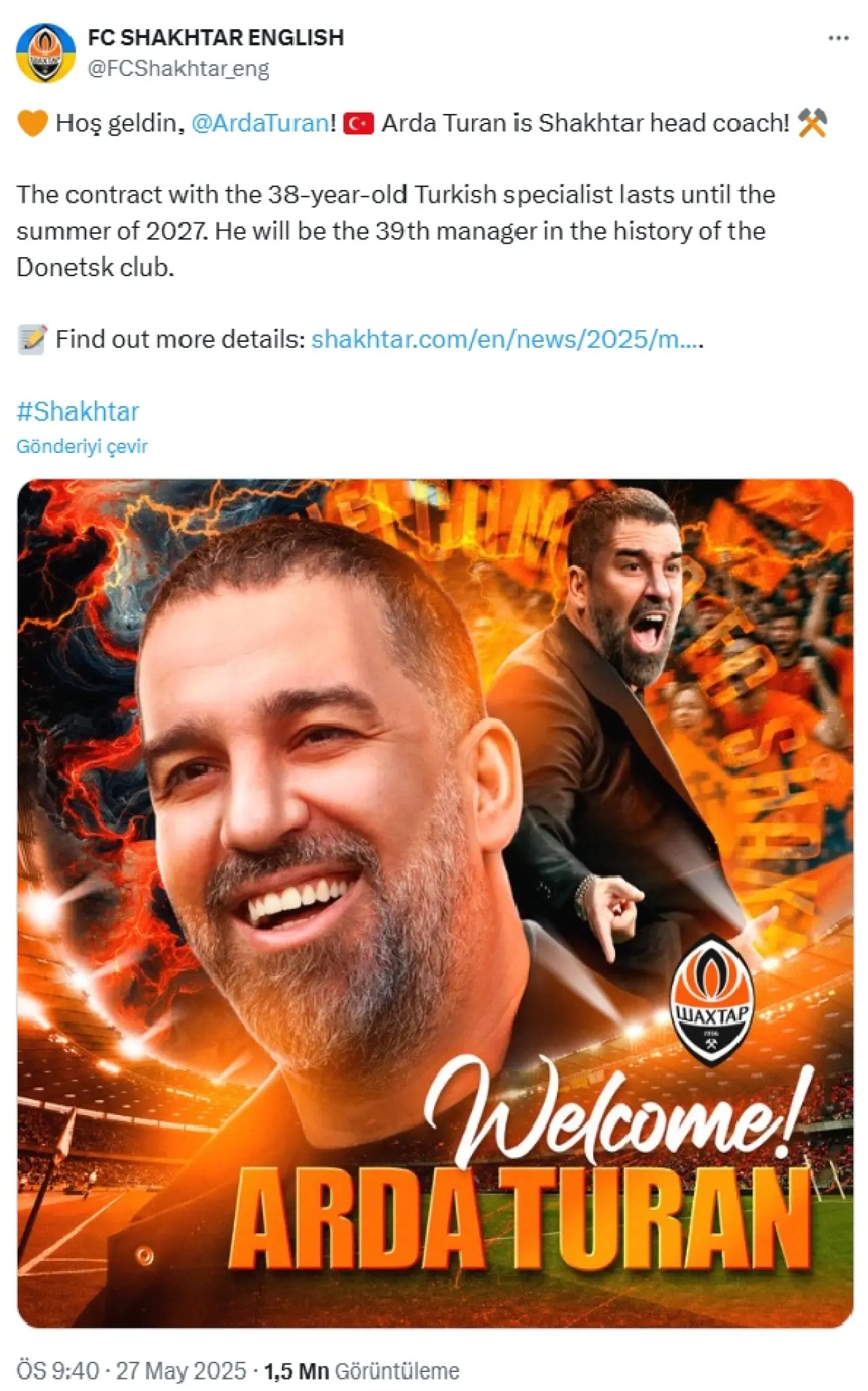 Shakhtar Donetsk’ten “Hoş geldin Arda Turan” başlığıyla yapılan açıklamada, “38 yaşındaki Türk teknik adam ile 2027 yılının yazına kadar sözleşme imzalandı. Arda Turan, Donetsk kulübünün 39'uncu teknik direktör olacak.” ifadeleri kullanıldı.