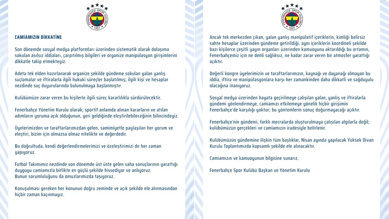 Sosyal medya üzerinden hayata geçirilmeye çalışılan yalan, yanlış ve iftiralarla gündemi yönlendirmeye, camiamızı etkilemeye yönelik hiçbir girişimin Fenerbahçe’de karşılığı yoktur; bu yöntemlerin sonuç doğurmayacağı açıktır.