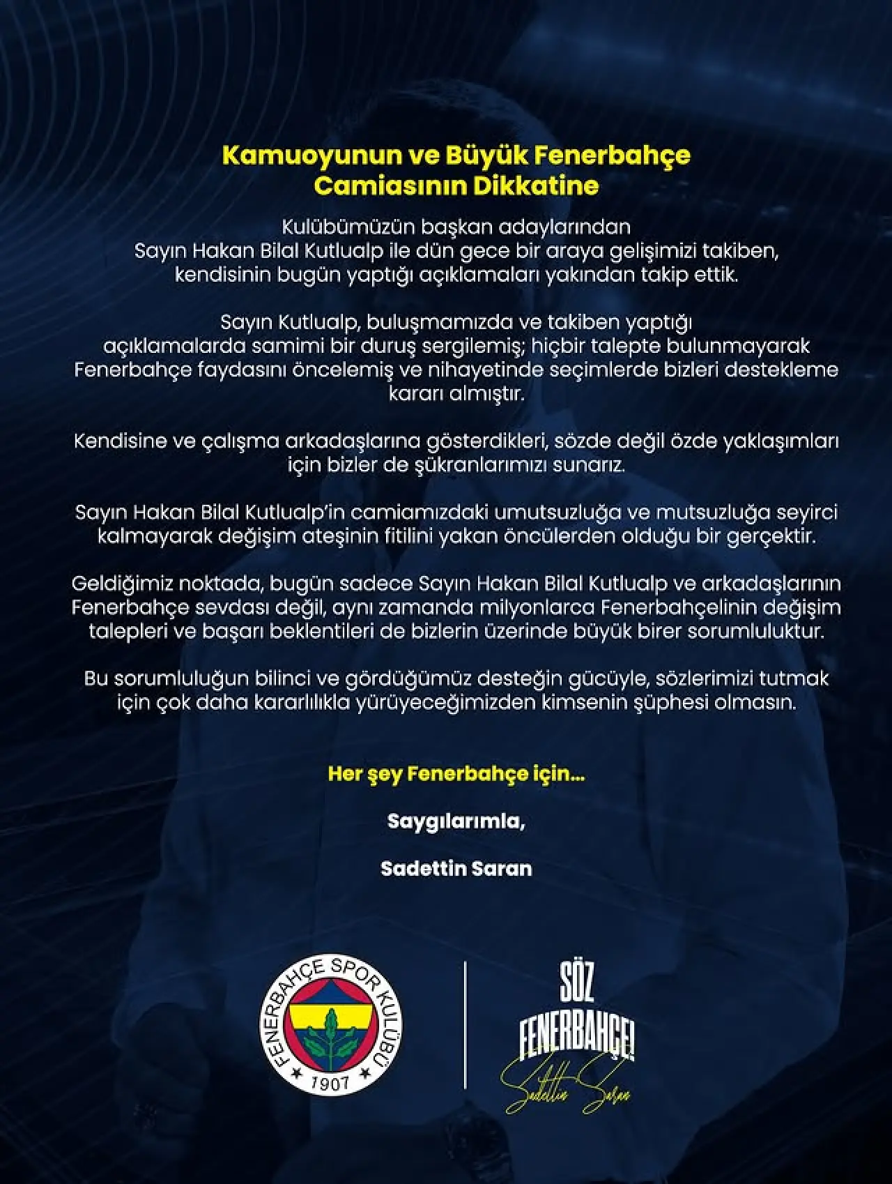 Fenerbahçe Başkan Adayı Sadettin Saran, Hakan Bilal Kutlualp’in adaylıktan çekilmesinin ardından yazılı bir açıklama yayımladı.