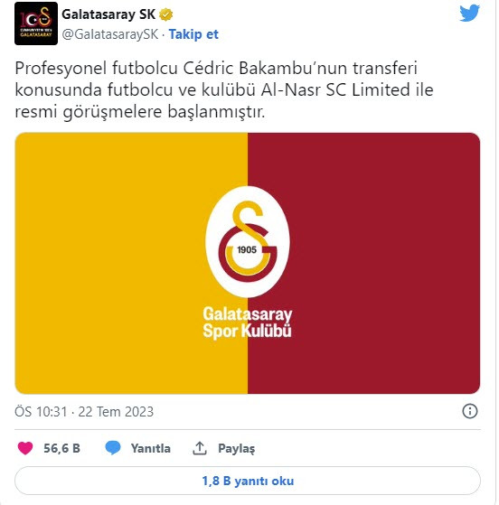 Yapılan açıklamada, "Profesyonel Futbolcu Cedric Bakambu'nun transferi konusunda futbolcu ve kulübü Al-Nasr SC Limited ile resmi görüşmelere başlanmıştır." denildi.