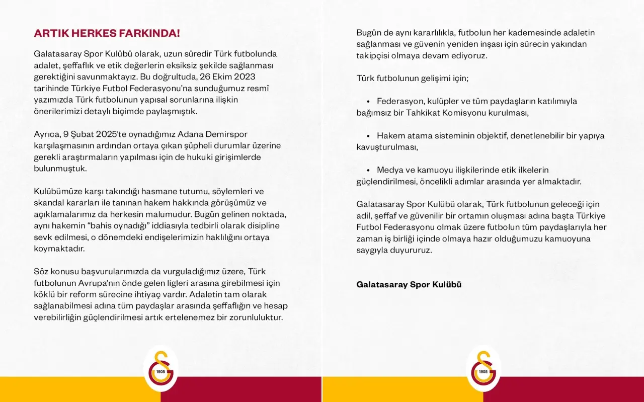 “Galatasaray Spor Kulübü olarak, uzun süredir Türk futbolunda adalet, şeffaflık ve etik değerlerin eksiksiz şekilde sağlanması gerektiğini savunmaktayız. Bu doğrultuda, 26 Ekim 2023 tarihinde Türkiye Futbol Federasyonu’na sunduğumuz resmî yazımızda Türk futbolunun yapısal sorunlarına ilişkin önerilerimizi detaylı biçimde paylaşmıştık.