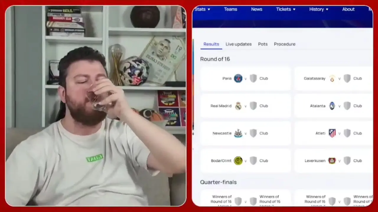 Kendi YouTube kanalı üzerinden kura çekimini anlık olarak takipçilerine aktaran Karakullukçu, sarı-kırmızılı ekibin İngiliz devi Liverpool ile eşleşmesinin ardından büyük bir heyecan yaşadı. Canlı yayında eşleşmeyi değerlendirdiği sırada masasında duran suya yönelen Karakullukçu, niyetli olduğunu unutarak bir yudum su aldı.
