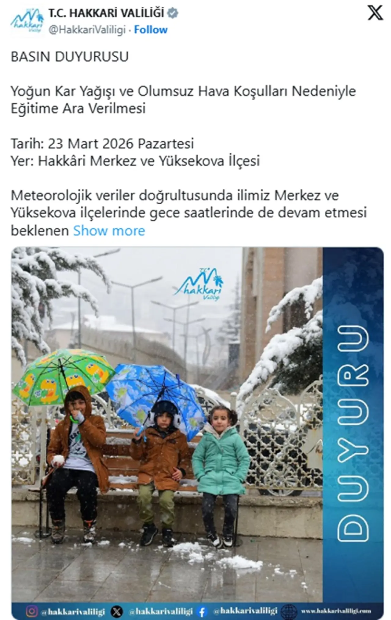 “Yoğun kar yağışı ve buzlanma riski nedeniyle Hakkari merkez ve Yüksekova ilçesindeki tüm resmi ve özel eğitim kurumlarında 23 Mart Pazartesi günü 1 gün süreyle eğitime ara verilmiştir. Ayrıca, Rehberlik ve Araştırma Merkezlerinde (RAM) randevusu bulunan öğrenciler ile engelli bireylerin ulaşım sürecinde karşılaşabilecekleri riskler göz önünde bulundurularak, can güvenliklerinin sağlanması amacıyla RAM'larda da aynı tarihte hizmete ara verilmesi uygun görülmüştür.”
